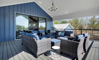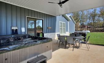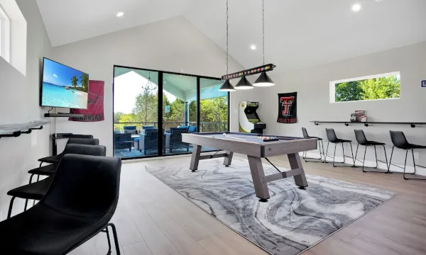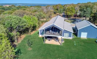 This luxurious and modern barndominium has everything you are looking for. Relaxing in the hot tub, unwinding by the fire pit, enjoying a game of pool or Golden Tee, or watching the sunset on the balcony. This house also includes a fully stocked kitchen with a double oven for ease of hosting your large group. Just miles away from 3 marinas, Tanglewood Golf Course, restaurants and more, this location offers a wide variety of activities and amenities to suit the whole family!