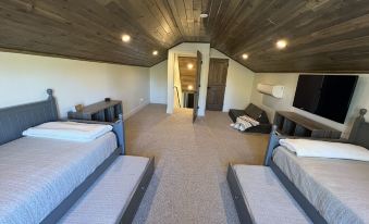 In addition to the two master bedrooms, you will find a third bedroom with a queen sized bed and a fourth bedroom with a trundle bunk bed, cozy closet nook, toys, and books. Up the stairs takes you to the loft, complete with two trundle beds, a nugget couch, and smart TV.