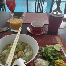 Есть ресторан, где можно заказать еду даже поздно вечером. Выезд бесплатный до 15:00, и это здорово. Вы можете принять душ перед поездкой в аэропорт. Официанты все улыбаются, а еда настоящая камбоджийская. кухня.