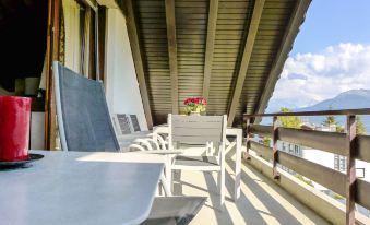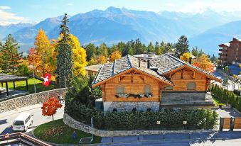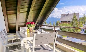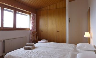 Apartment house "Victoria A/B/C". In the centre of Montana, in a central, sunny position, 450 m from the lake, 400 m from the skiing area. In the house: lift, storage room for skis, central heating system, washing machine, tumble dryer (for shared use, extra). Public car park, extra. Shop 10 m, supermarket 100 m, restaurant 15 m, bakery 100 m, bus stop "Ycoor" 140 m, railway station "Funiculaire Montana Gare" 550 m, bathing lake "Moubra" 1.4 km, lake Grenon 450 m. Golf course (18 hole) 1.7 km, tennis 1.4 km, riding stable 1.2 km, skisport facilities 400 m, ice rink 200 m. Nearby attractions: Casino 150 m. Well-known lakes can easily be reached: Etang Long 1.7 km. Please note: ski bus (free of charge). Additional accommodations can be booked. "Victoria C 8", 3-room apartment 72 m2 on 3rd floor. Comfortable and cosy furnishings: living/dining room with sloping ceilings with cable TV and flat screen. Exit to the balcony. 1 room with 2 beds (90 cm, length 200 cm), bath/WC. 1 room with 2 x 2 bunk beds (80 cm, length 190 cm). Exit to the balcony, east facing position. Kitchenette (oven, dishwasher, 4 ceramic glass hob hotplates, toaster, kettle, microwave, electric coffee machine, Capsules for coffee machine (NESPRESSO) extra, raclette grill, fondue Set (cheese)) with dining table. Shower/WC. Balcony, south-west facing position. Balcony furniture. View of the mountains. Facilities: iron, hair dryer. Internet (WiFi, free). Garage space n 8, height 200 cm, width 220 cm. Please note: non-smokers only.