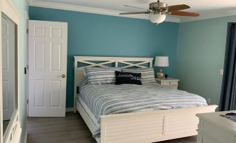 Upstairs, there are two bedrooms with walk-in closets, private en-suite bathrooms, and flat-screen TVs. The owner suite has a private balcony that overlooks the intercoastal waterway.