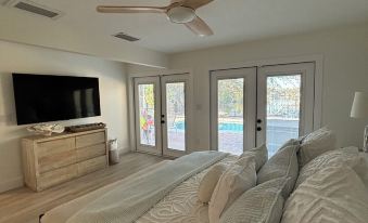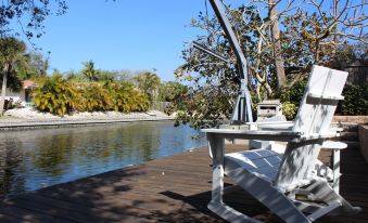 Your private resort amenities include a heated pool, hot tub, fire pit, and a private dock overlooking an endless canal. The focal point is the private dock, inviting you to explore the waterways or savor the breathtaking views. Fishing from your dock becomes a serene pastime, where you can witness dolphins, manatees, and pelicans enjoying the warm canal waters or boats passing by. The home is thoughtfully equipped with kayaks, allowing you to embark on water adventures right from your doorstep. Bring your own boat and tie it to our dock to explore all Siesta has to offer. Take a dip in the heated glistening pool or unwind in the inviting hot tub, surrounded by the lush tropical landscape framing this coastal oasis. After a day of exploring the island beaches and sinking your toes into the powdery sand, enjoy the evening gathering around a cozy fire pit. This home is designed for ultimate relaxation and outdoor enjoyment.