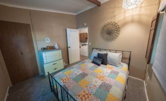 We have 1 traditional bedroom, with a queen sized bed, dresser and closet. Our second bedroom/groovy rec room has a twin-sized daybed and trundle bed. You can use it as a private bedroom with a sliding barn door, or enjoy the space as a quiet hangout, with a record player, card table and view of the backyard garden.