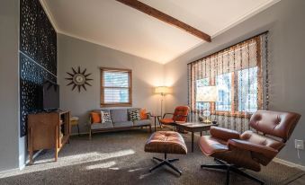 Our guests tell us that the vaulted post and beam ceilings and retro touches make the house both spacious and cozy at the same time. It's the perfect place to slip off your shoes and relax after a long day, 1950s style. If you want to kick back like Don Draper, we even have a cocktail shaker set ready for your "Mad Men" happy hour.