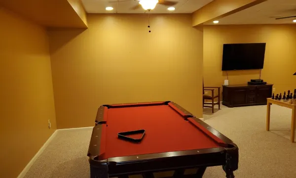 The lower level includes a bunk room and great room. The great room has a foosball table and pool table with a ping pong table conversion top, as well as, a 65" big screen tv with an Xbox 360 game system and controllers. The bunk room comfortably sleeps six with one full bed, three twin beds and a trundle. The lower level also has a full bath with a walk in shower. The covered outdoor patio off this level leads to a flat lakeside yard perfect for corn hole, croquet or a backyard firepit with s’mores.