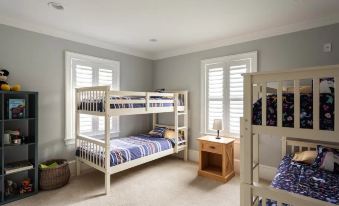 The guest house is its own self-contained home with private entrance. There is a living room with TV and a fully-stocked kitchen with half bath. Upstairs, find the third "family suite" with 2 queen beds, a twin over twin bunk and a stylish full bath.