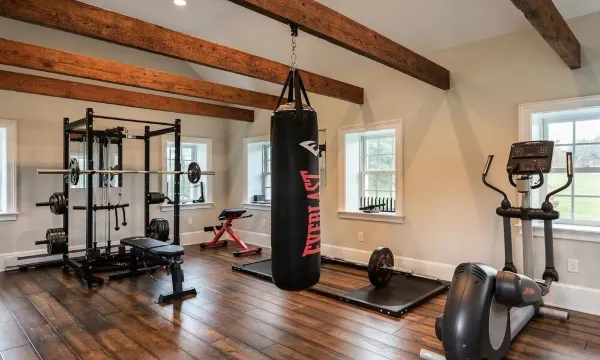 The original springhouse has been converted into a gym with free weights, heavy bag, rowing machine, and elliptical.