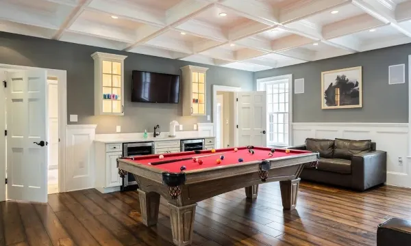 The main floor of the main home has 2 half baths and a full bath which is great for after the pool. There is a formal living room with wood burning fireplace,, a lounge area with pool table, wet bar, and beverage refrigerator. Off the lounge is a family room with cathedral ceilings, huge comfy couch, and 65" TV. Finally, completing the first floor is a den with luxurious leather furnishings, wood burning fireplace, and walls that would talk if they could!