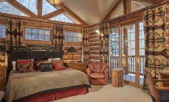 Tall Timbers Lodge has 5 bedrooms and 6 bathrooms. Two of the bedrooms are Master Suites. Four of the bedrooms are on the upper level excepting “Cowgirl Heaven” which is on the first level and down the hall from the family room.