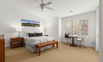 The townhouse features three exquisite bedrooms designed for ultimate relaxation and comfort. The primary bedroom, located upstairs, is a sanctuary of its own. Here, you’ll find a plush King bed that promises restful nights, a ceiling fan to keep you cool during warmer months, and a 55" Samsung smart TV for your entertainment. Whether you wish to unwind with a movie or simply bask in the comfort of your surroundings, this room offers it all. The ensuite bathroom elevates your stay with a spa-like experience, featuring a separate soaking tub for indulgent soaks, a shower, and a dual sink vanity, complete with a hair dryer for your convenience. This private haven allows you to start and end your day in luxury.