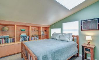 Upstairs is the main bedroom with a door onto the sunshine deck, the full bath (shower only) and another living area with a wood-burning stove. The Crow’s Nest bedroom is perched over the living area.