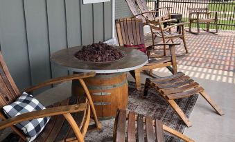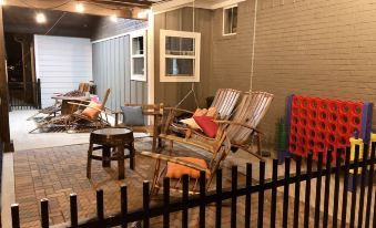 You can entertain all night long with an amazing outdoor area equipped with a propane fire pit 🔥 , rockers 🪑 , small propane grill, porch swing and outdoor yard games 🎲 . The outdoor space is completely fenced in to keep toddlers or pets 🐶 confined and safe while you enjoy relaxing at the end of the day. This size home will definitely sleep a couple families, comfortably.