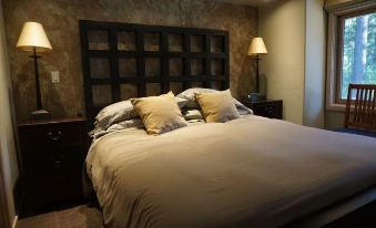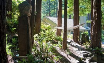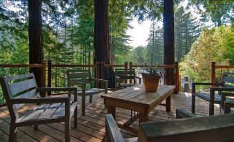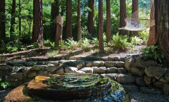The “cabin” is everyone’s favorite. The pine-paneled interior is a classic recreation of the traditional summer camp cottage. It has its own bathroom, luxurious king size bed, and heated outside shower. The cabin also adjoins a very large deck with its own views of the redwoods and gardens. It's a secluded gem.