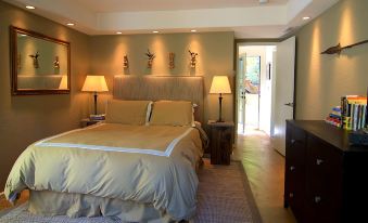The guest house has its own terrace and seating area. Its windows have beautiful garden views as well, but with different vistas, giving this two-bedroom space a unique atmosphere and privacy. It has two bedrooms, one with a king size bed, and one with a queen size bed, each with their own private entrance to the outdoors, connected by a common hallway to the bathroom. The spacious multi shower head bathroom offers a mini spa experience off a secluded and private patio.