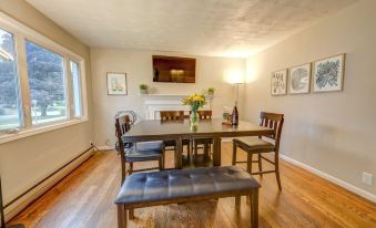 The main floor includes an eat-in kitchen with a new refrigerator, range and microwave; the kitchen is stocked with cookware, a toaster, coffee machine, and plate service and flatware for up to 12 (There is currently no dishwasher). Adjacent to the kitchen is the dining room with expandable table that can accommodate a large gathering for meals. The dining room also includes a large screen TV so you can enjoy watching a game or movie while you eat!