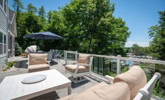 Step outside and find the luxuriant features that elevate the lakeside living, including a spacious patio with elegant furnishings and a portable firepit for al fresco dining and relaxation. The magnificent 3-season sunroom, featuring a wood-burning fireplace, 55” smart TV, stylish lounge furniture, and dining set, offers a tranquil sanctuary to unwind and bask in the marina view.