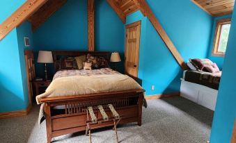 tables, a large second living room area with a soapstone wood stove and a wet bar complete with a second beverage fridge. A game table for one of the many jigsaw puzzles or games sits off to one side. A second King bedroom and full bath with tub add to the charm and comfort of the home.
