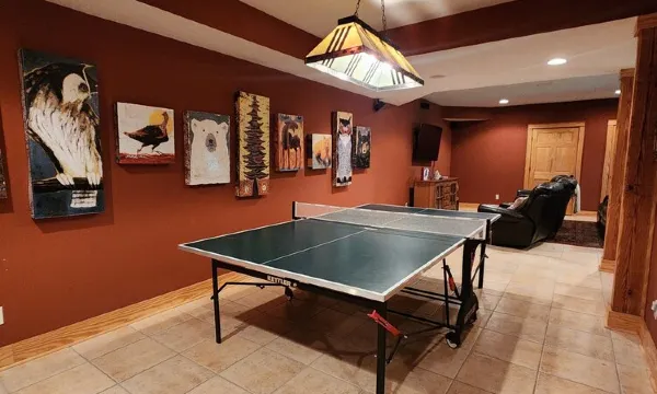 The walk-out lower level hosts a media room area, ping pong and foosball