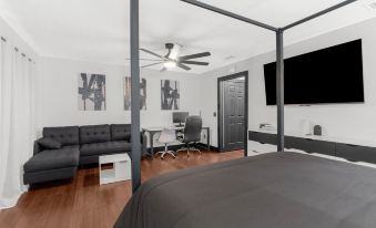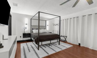Each of the 3 bedrooms provide plenty of natural light (or you can use the blackout curtains if that's more your speed) and have their own bathroom (with the caveat that the third bedroom's bathroom is accessible via the living room). Beds are stocked with brand new luxury bedding. A dedicated home office workspace is located in the back suite of the house (including an extra monitor, mouse and keyboard). A pack-and-play crib is also available in the master suite closet.