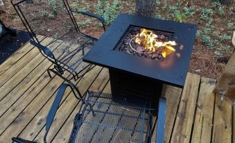 Bedroom 1 has a queen bed and a door with access to the main bath. Bedroom 2 is an open loft space on the 2nd floor with 2 double beds. A room divider is provided if guests choose to use it for added privacy. The living space is comfortable with new furnishings, a TV and WiFi. Kitchen is well stocked with all the basics for cooking meals. The deck is furnished with a gas grill, outdoor furniture, propane fire table, and a picnic table. There is also a campfire pit perfect for taking in the night sky and roasting smores. We now have an outdoor theater - Watch a movie or sports event under the stars, while relaxing in a hammock or around the campfire!