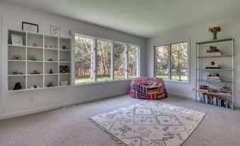 Enjoy the spectacular light streaming through multiple skylights and high ceilings, creating a welcoming and spacious atmosphere. The cottage features three well-appointed bedrooms with premium linens to ensure a restful and luxurious stay, and three newly renovated full bathrooms provide all the comforts of home. A flexible meditation room offers a peaceful space that can be used as a playroom, tailored to your needs.