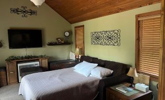 The master bedroom has a king-sized bed with a loft area that is best suited for children who are able to independently climb a ladder. The living room is equipped with a pull-out couch (queen) as well as a pull-out chair (twin). There are sliding barn doors on the living room for added privacy.