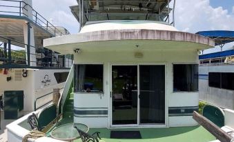 The Summertime Houseboat Oasis offers an experience similar to “glamping.” It has some modern conveniences and decor, but is simply a humble houseboat on the bayou. More similar to a RV than a hotel or yacht, it is for people willing to embrace a slower pace and down to earth accommodations. It is capable of sleeping 6 people comfortably. The exterior of our boat is weathered and rustic and prone to green algae - a result of the environment of the Bayou.