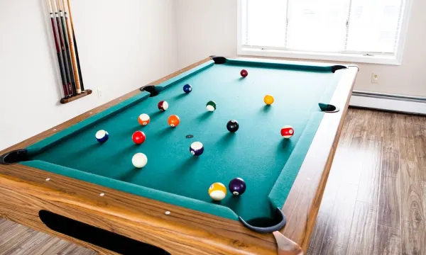 The main level features a dining room, living room, billiard room and an eat-in kitchen that is adjacent to a large deck.