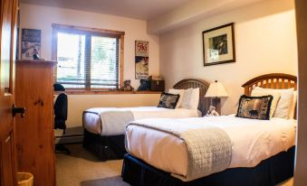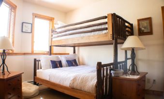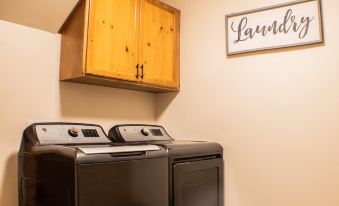 On the lowest level there are two bedrooms, each with their own full bathrooms. One of the spacious bedrooms has 2 twin beds, the other has a twin over queen adult weight bunk bed, which can serve as a place for the kids to watch the large flatscreen TV. There is also a fold out twin mattress and portable crib available in the closet. The large laundry room has a full size washer and dryer and plenty of space to keep jackets and snow clothes warm. Laundry soap is supplied.