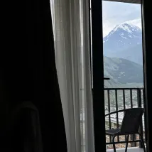 Вид: Судя по многочисленным отзывам, сравнивающим этот отель с номерами, мне кажется, что вид на гору Казбек совсем другой; он заметно меньше, и перед ним есть ограждение.