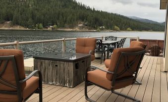 Enjoy your morning coffee and relax on the deck, which cantilevers over the water with panoramic views of Deer Lake. There’s a propane fire pit on the deck and we’ll make sure that you have a full tank of propane waiting for you. Next to the deck on the concrete area, there’s also a natural wood burning fire pit. If you want to use that one, you should bring as much firewood with you as you’d like to use, which you can usually pick up in Deer Park on the way to the cabin.
