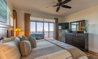 The king suite boasts breathtaking views from the comfort of the room or step directly onto the deck to immerse yourself in the layered mountains. Its private ensuite bathroom is a serene retreat, featuring a tiled shower, a soaking tub, and double granite vanities. The second bedroom includes a Queen bed and offers private access to its own bathroom, complete with a tiled tub/shower combination. This bathroom also connects to the living area for added convenience.