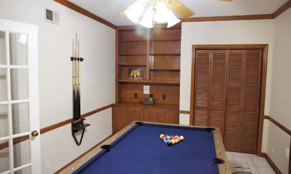 Downstairs you will find the second living room with two couches that convert into twin beds, the bunk room, a wet bar area, a pool table room, a full bathroom, the office/flex room, and the laundry room. The patio doors open onto the large pool deck area where you will find a shaded seating area, lounge chairs and the hot tub.