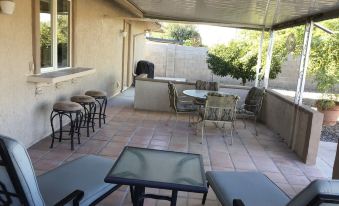 This two bedroom, two bath home has it all! A comfortable living room with a 50" TV with streamed live TV and programs. Quartz countertops in the kitchen and baths. The kitchen is well stocked with pots, pans, and other items. There is also a pass through window from the kitchen to the back patio for entertaining purposes. Covered patio with comfortable patio furniture. Two car garage is spacious.