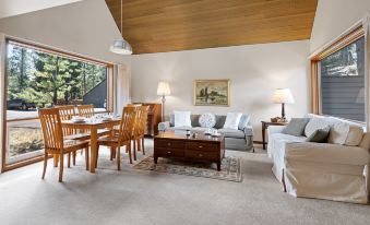 Light and bright with vaulted ceilings, the spacious main room is ideal for gathering and relaxing with comfortable furnishings and a dining table that seats 6.