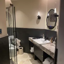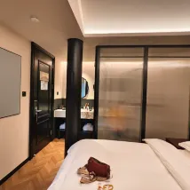 Номер оформлен очень изысканно, в целом чистый и аккуратный. Постельное белье мягкое и удобное. Лежа на нем, чувствуешь себя так, словно падаешь на облако и хорошо высыпаешься. Ванная комната разделена на сухую и влажную зоны, туалетные принадлежности очень хорошего качества, а детали свидетельствуют о профессионализме.