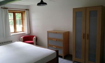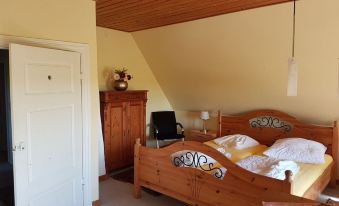 On the large, park-like natural plot (about 8.500 square meters) with old trees, there are large playgrounds, a vegetable and flower garden and a small duck pond. Both apartments are spread over two floors and offer space for max. 6 persons. On the ground floor (some with underfloor heating) are: kitchen (fitted kitchen with dishwasher, cooker with ceramic hob / oven, coffee maker, kettle, toaster, good equipment), dining / living room with fireplace, stereo, TV (satellite), a bedroom with 2 single beds and a bathroom (WC + shower).