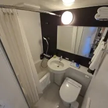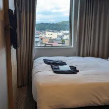 На мой взгляд, проживание здесь не стоило своих денег. Двухместный номер на две ночи без завтрака обошелся более чем в 1400 [валюты, например, иен], а с завтраками за два дня вышло около 1700. Комната была действительно очень маленькой, даже один чемодан не удалось полностью раскрыть. И при этом в таком крошечном пространстве они умудрились разместить маленький столик и два стула со спинками! Отель расположен недалеко от станции Такаяма, примерно в 7 минутах ходьбы. Главное, они заявляют, что у них есть онсэн, но по факту это всего лишь один бассейн с очень сильным запахом хлорки. Больше похоже на обычную общественную баню, чем на настоящий горячий источник. Завтрак был неплох. В первый день очень понравились котлеты из говядины Хида. В отеле было очень много европейцев; на завтраке практически все постояльцы были иностранцами.