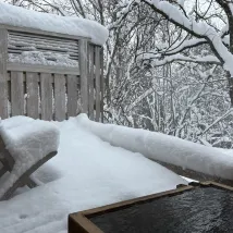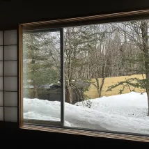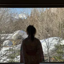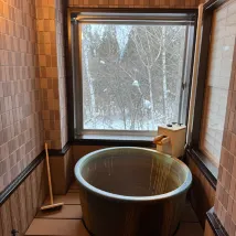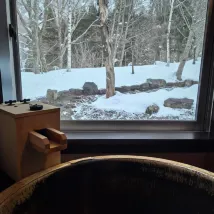 Отель довольно большой, поэтому для передвижения по нему нужна карта. Мы забронировали отдельную ванную комнату, а не ванную комнату на открытом воздухе, что обеспечивало достаточное уединение. Вид из окна был потрясающим, как и снежный пейзаж.