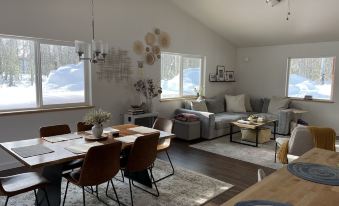 Inside, there is a couch you won’t want to leave, a fully stocked kitchen, and large windows to watch the moose stroll by and large fluffy snow flakes fall.
