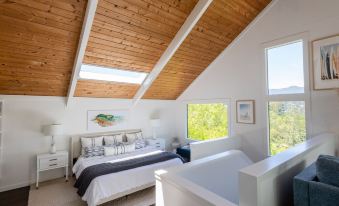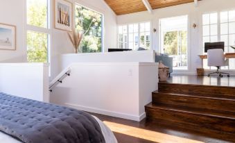 Upstairs you'll find the master bedroom suite (762 square feet) which includes a large open room with cathedral ceilings. The room is very large and has a bedroom area with a king bed, built-ins with a TV, master closet with dressing table/lighted vanity mirror, full bathroom with shower and bathtub. Up a few stairs in this room, there's a living room/lounge area with a TV, and sectional queen sleeper sofa. There's an attached solarium with a kitchenette, laundry, and a hanging swing chair overlooking Mount Tamalpais. This area has slider doors that open to an outdoor deck with gas fire pit. The master suite has two Sonos speakers, Sonos Soundbar, and Brilliant Home device to play music.