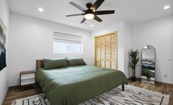 The master bedroom is equipped with a king bed as well an attached full bathroom with a standing shower.