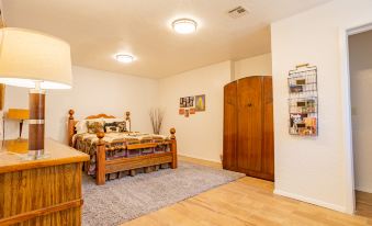 The log cabin has 3 bedrooms located upstairs. The master bedroom has a king bed with a connected master suite that features a jacuzzi tub. The other two bedrooms have both a king and a twin bed with twin trundles. There is also a bedroom downstairs on the same level as the garage. This bedroom hosts a queen sized bed.