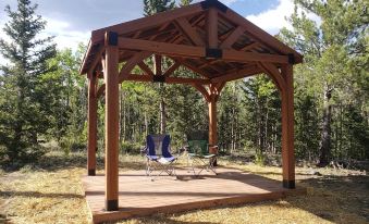 The interior log cabin, appointed with vaulted, tongue and groove beamed ceiling is an ideal place where your family and guests can come together to celebrate your special day. Accommodations are for up to 6 guests in the main cabin with a king bedroom and two other queen bedrooms. A new groom's bunkhouse, sleeping another 4 guests is available. Other log cabin amenities are wood and slate floors, fully equipped kitchen with stainless steel appliances, luxurious lighting, wine cooler, granite counters, and tasteful Colorado style decor, including wall mounted Elk antlers. Two full bathrooms round out the log cabin.