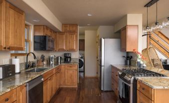 The fully equipped kitchen has everything you need to prepare meals for your entire group. It features stainless steel appliances, a full set of cookware and silverware, a coffee machine, toaster, blender, slow cooker, and a spice rack. Plus, there's a grill kit for the Blackstone outside and all the essential kitchen tools to make cooking effortless. The dining table seats eight, with additional seating for four at the counter, ensuring plenty of space for everyone.
