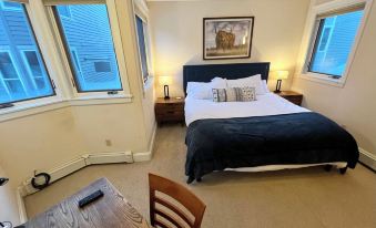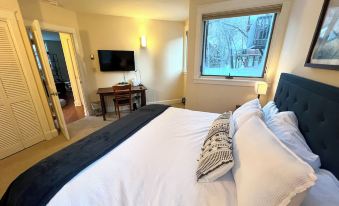 The bedroom is spacious with a king bed, tv, and plenty of storage for all of your belongings. There is a desk in the bedroom in case you need to get some work done during your stay.