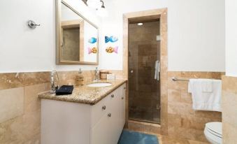 Walking in you will feel right at home in this new space. Enjoy a peaceful nights rest in a king size bed while the kids are sleeping on the pull out sofa or pack and play. The walk in shower is sure to be your magical escape after a long day at the beach and at night enjoy the large patio/balcony where you can listen to the sounds of the tiny island.