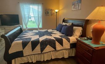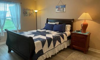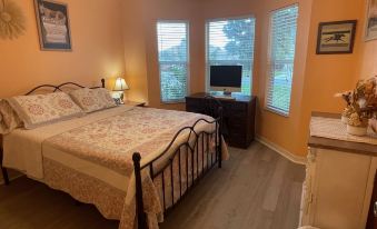 Guests will feel right at home in the back guest room, which includes a queen-size bed and a TV for added comfort. The front guest room is versatile, offering a queen-size bed and a desk equipped with an all-in-one computer, making it perfect for those who need a quiet space to work or relax.