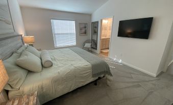 The master bedroom is a true retreat with a lavish king-sized bed, promising nights of restful slumber. Equipped with its own 55" TV, this room invites you to indulge in a private cinematic experience. The large walk-in closet provides ample storage space for your belongings, allowing you to keep your living area clutter-free.