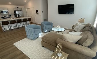 Step into this beautifully designed home, where every detail has been meticulously crafted to provide you with the utmost comfort and convenience. The spacious living room boasts a 55" TV, creating the perfect space for relaxation and entertainment. Unwind on plush sofas after a day of exploration or catch up on your favorite shows in style.